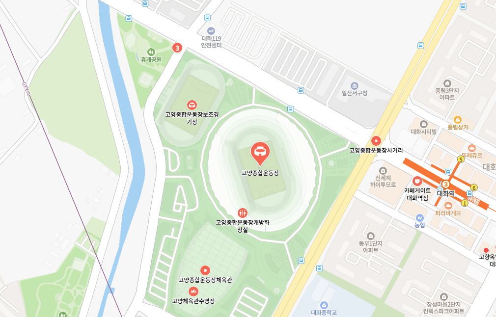 - 고양종합운동장 하차: 55, 88A, 88B, 999, 1100